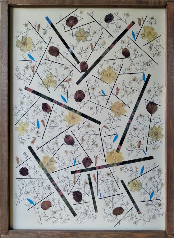 Πίνακας με αποξηραμένα φύλλα φραουλιάς, λουλούδια πρίμουλα και λουλουδάκια «μη με λησμόνει». Διατίθεται με χειροποίητη ξύλινη κορνίζα και τζάμι.