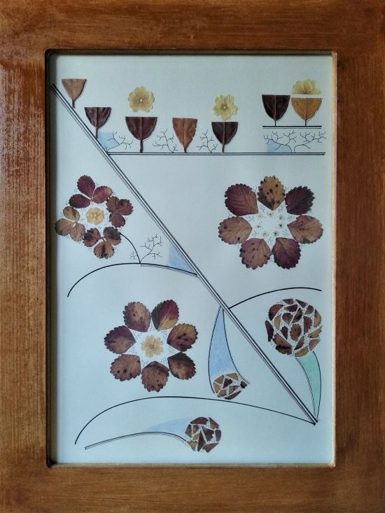 Πίνακας με αποξηραμένα φύλλα από φραουλιές, δάφνη και βιβούρνο. Διατίθεται με χειροποίητη ξύλινη κορνίζα και τζάμι.