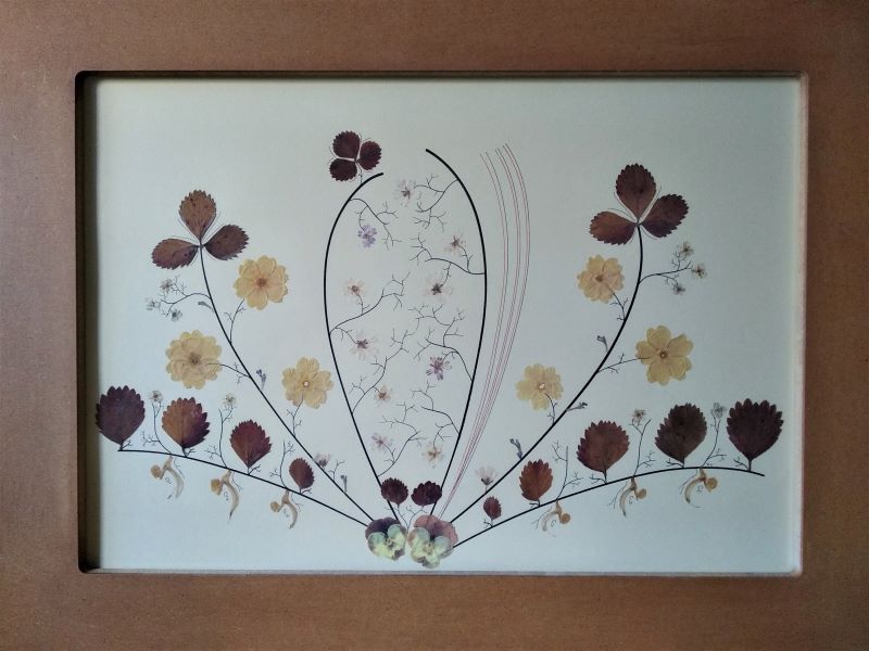 Πίνακας με αποξηραμένα φύλλα από φραουλιές, πανσέδες, πρίμουλα, λουλουδάκια «μη με λησμόνει» και αγριολούλουδα. Διατίθεται με χειροποίητη ξύλινη κορνίζα και τζάμι.