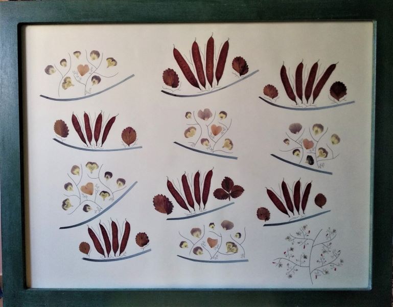 Πίνακας με αποξηραμένα φύλλα από κουτσουπιά, φραουλιές, πανσέδες και λουλουδάκια «μη με λησμόνει». Διατίθεται με χειροποίητη ξύλινη κορνίζα και τζάμι.