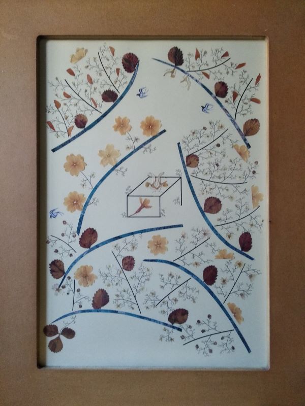Πίνακας με αποξηραμένα φύλλα από φραουλιές, πρίμουλα και λουλουδάκια «μη με λησμόνει». Διατίθεται με χειροποίητη ξύλινη κορνίζα και τζάμι.