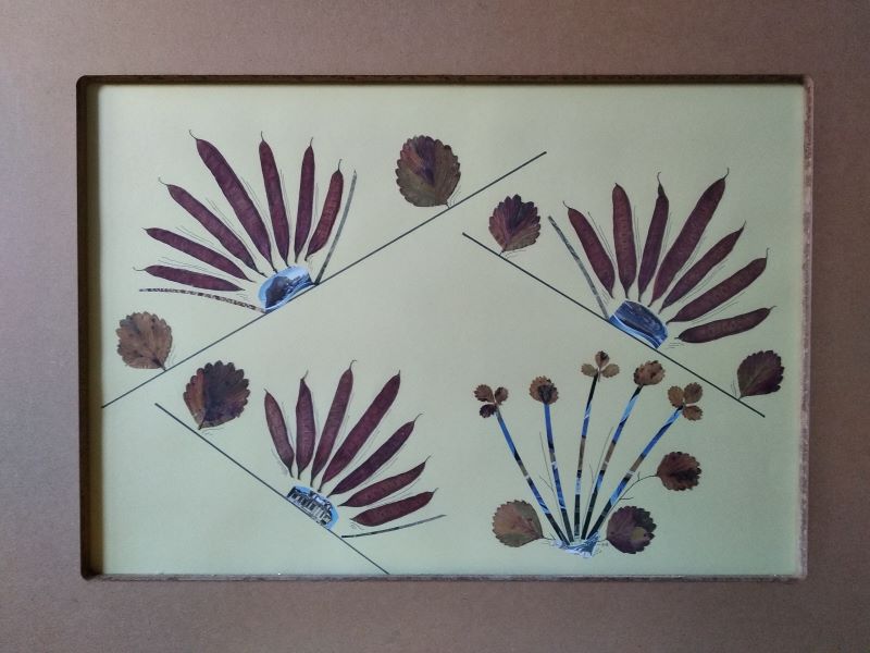 Πίνακας με αποξηραμένα φύλλα από φραουλιές και καρποί κουτσουπιάς. Διατίθεται με χειροποίητη ξύλινη κορνίζα και τζάμι.