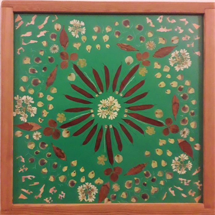 Φύλλα δάφνης, φραουλιάς, πέταλα πανσέδων, μαργαρίτες, λουλούδια από κολλιτσίδα, σπόροι κουτσουπιάς και γραμματόσημα. Διατίθεται με χειροποίητη ξύλινη κορνίζα και τζάμι.