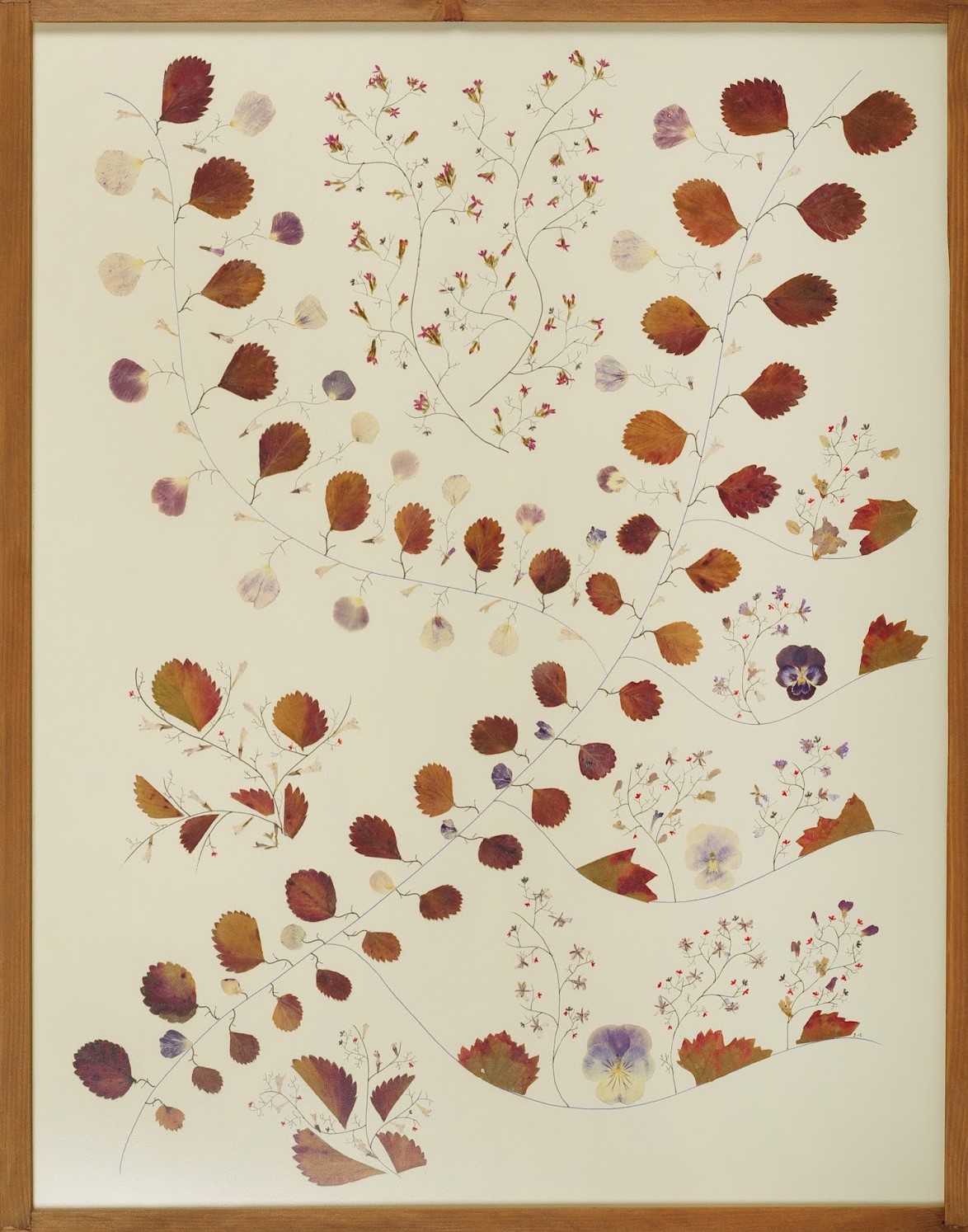Πίνακας με φύλλα φραουλιάς και αμπελιού, αγριολούλουδα και πέταλα πανσέδων. Διατίθεται με χειροποίητη ξύλινη κορνίζα και τζάμι.