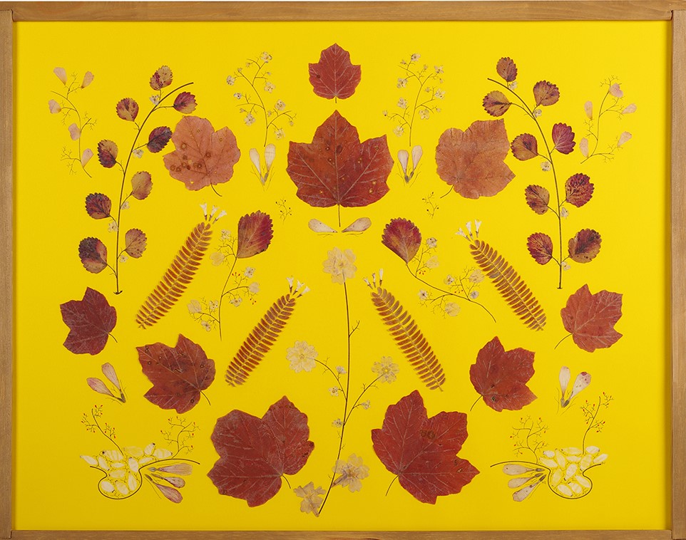 Πίνακας με φύλλα από φραουλιές, σφεντάμι, ροδομετάξη και αγριολούλουδα. Διατίθεται με χειροποίητη ξύλινη κορνίζα και τζάμι.