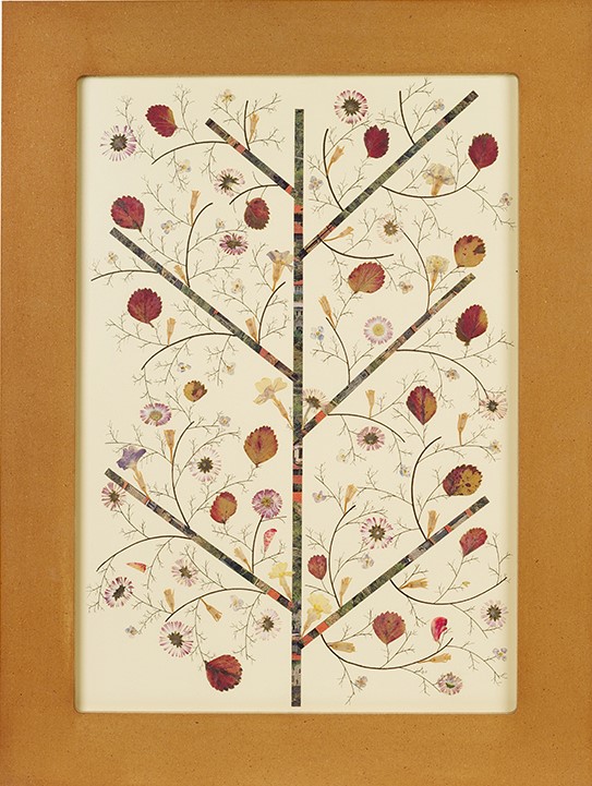 Πίνακας με φύλλα από φραουλιές, αγριολούλουδα και σινική μελάνη. Διατίθεται με χειροποίητη ξύλινη κορνίζα και τζάμι.