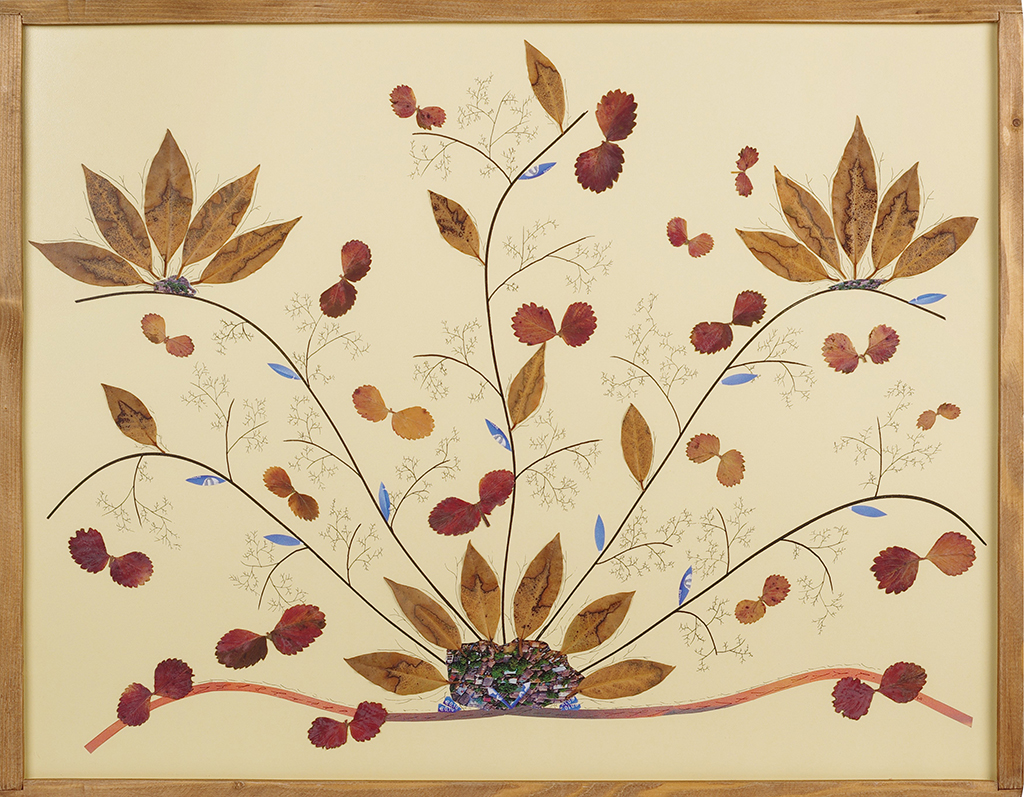 Πίνακας με φύλλα από δάφνη και φραουλιές, κομμάτια γραμματοσήμων και σινική μελάνη. Διατίθεται με χειροποίητη ξύλινη κορνίζα και τζάμι.