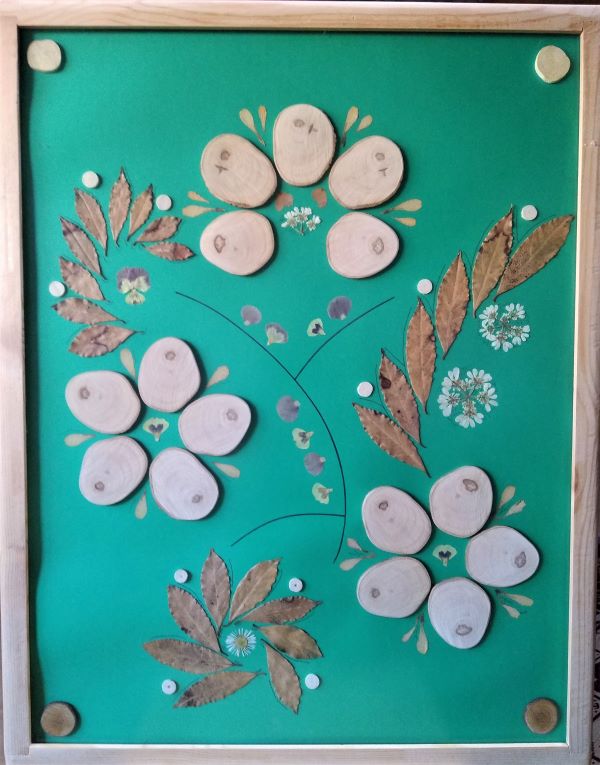 Πίνακας με εγκάρσιες τομές από γαύρο πάχους 5χιλ., φύλλα δάφνης, πέταλα από πανσέδες και κολιτσίδα. Διατίθεται με χειροποίητη ξύλινη κορνίζα και τζάμι.