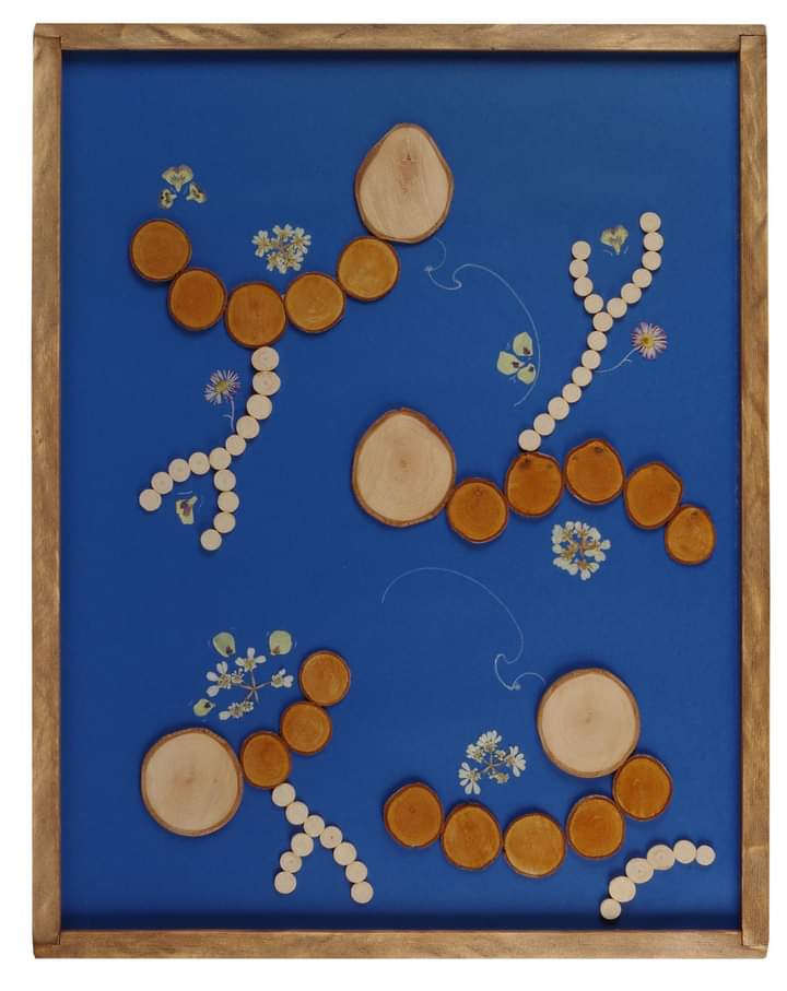 Πίνακας με εγκάρσιες τομές οξιάς, φλαμουριάς, ακακίας και άνθη κολλιτσίδας και πανσέδων. Διατίθεται με χειροποίητη ξύλινη κορνίζα και τζάμι.