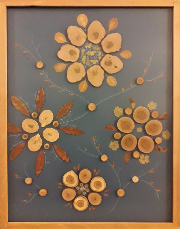 Τομές από λιγούστρο, ακακία, λωτό, λεύκα, φύλλα δάφνης, φλαμουριάς και αγριολούλουδα. Διατίθεται με χειροποίητη ξύλινη κορνίζα και τζάμι.